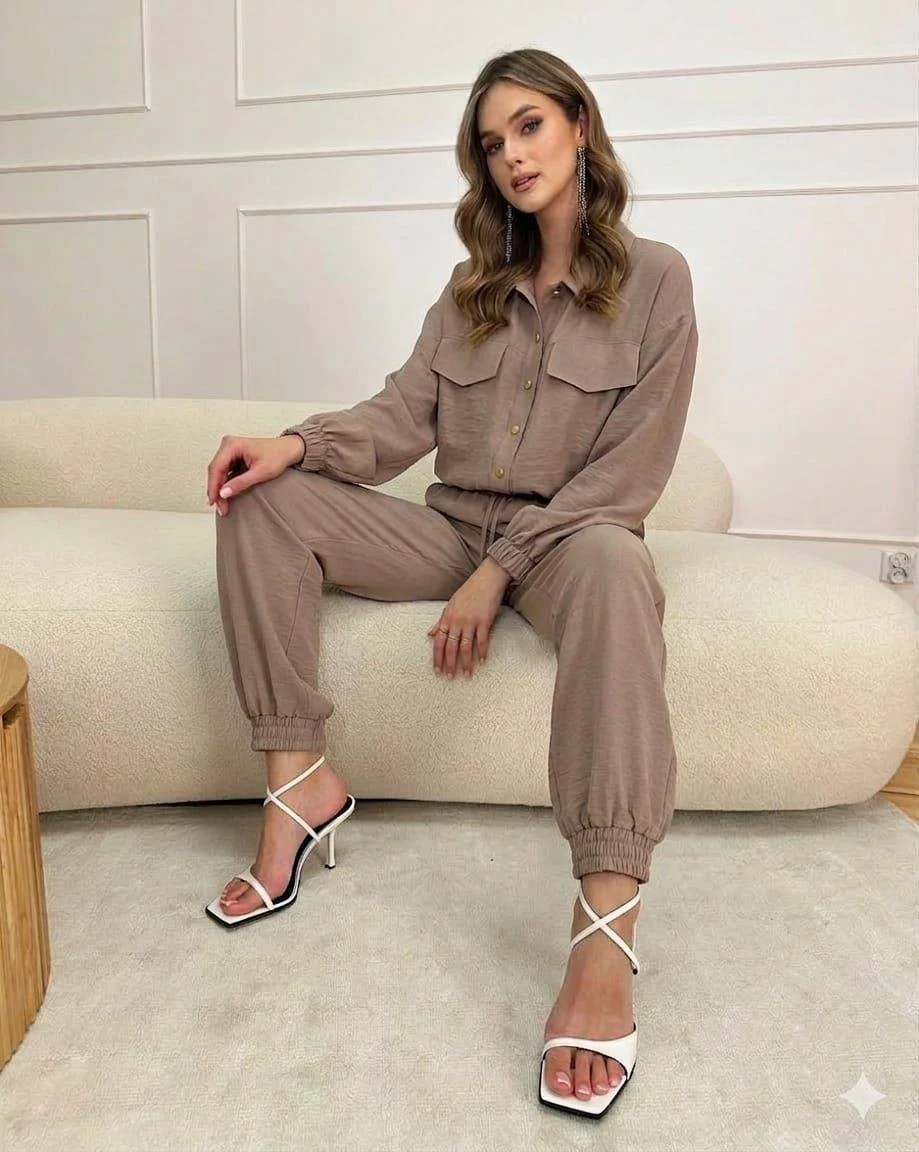 Tkanina jest przyjemna w dotyku, przewiewna i pięknie układa się na sylwetce, podkreślając jej naturalne linie. Całość dopełniają subtelne detale w postaci złotych nap, które nadają kompletowi eleganckiego charakteru.